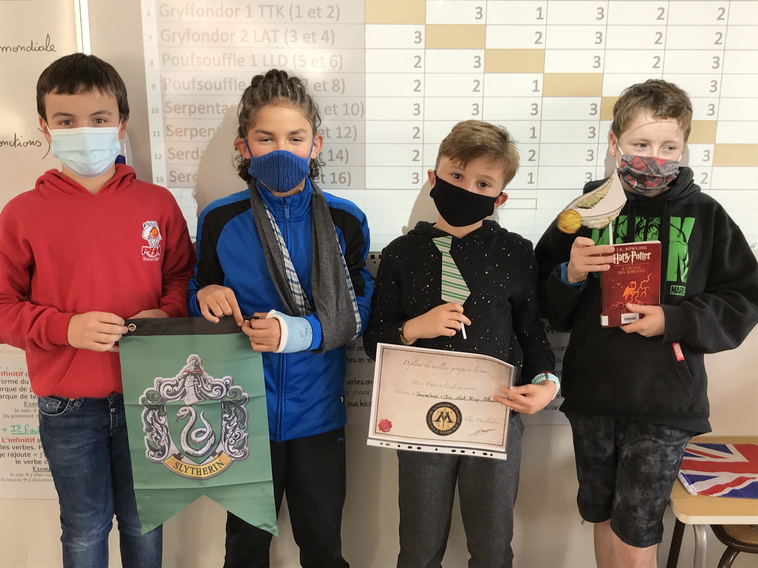 Pendant les dernières vacances, les élèves ont terminé la lecture de Harry Potter à l’école des sorciers. A la rentrée, un quizz entre les maisons les attendait… Et c’est l’équipe de Serpentard 1 qui a remporté le concours !
