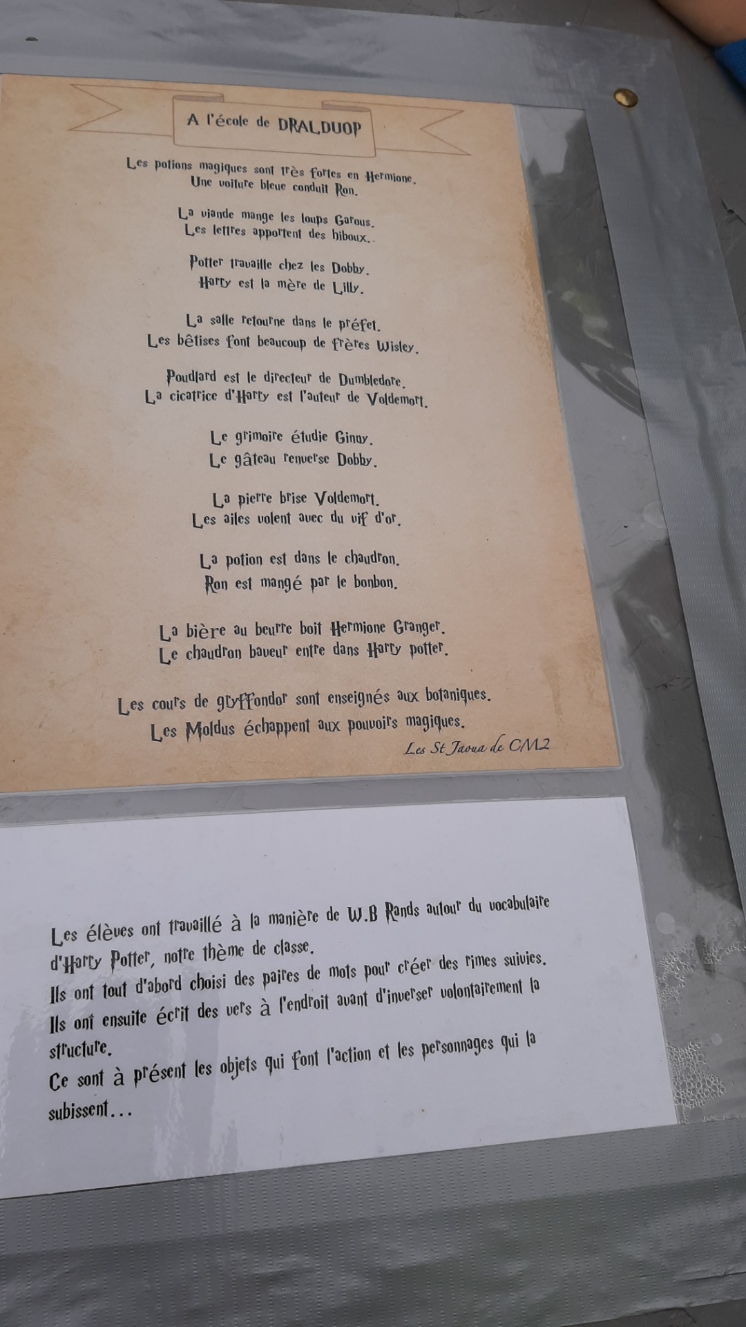 Nous sommes allés jusqu’à La Chapelle St Jaoua pour observer l’exposition de dentelles et de poésies… Surtout qu’il y a fait celle de la classe intitulée “à l’école de Dralduop” !