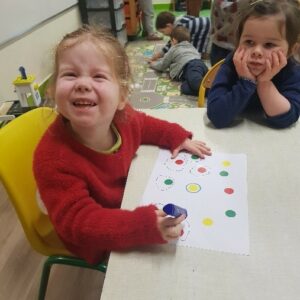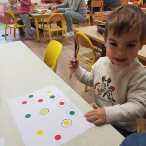 Par la suite, nous avons pris notre crayon pour nous entraîner à tracer nos cercles autour de gommettes placées sur une feuille par la maîtresse.
