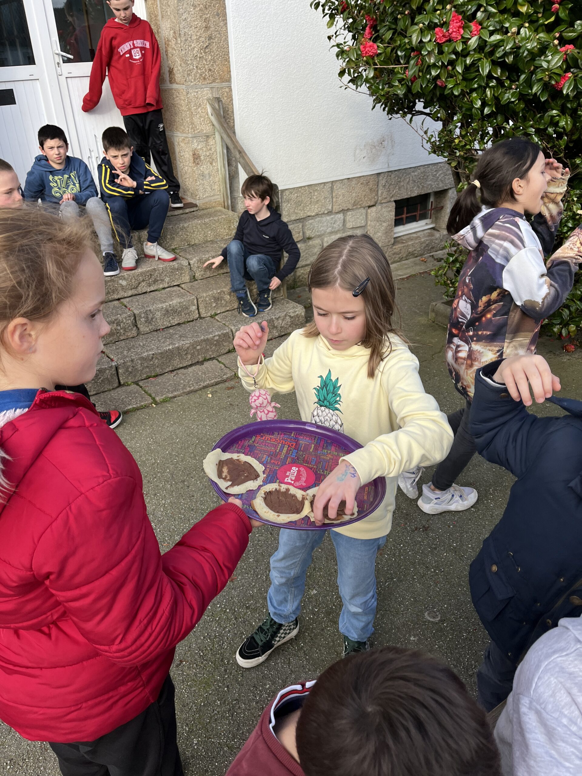Ce vendredi 16 février, les 2 classes “partenaires” CP-CM-B” ont confectionné des crêpes avec l’aide de Valérie et de Céline (AESH dans l’école).